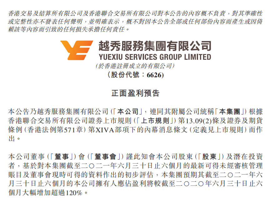 7月15日,开元ky888服务集团有限公司(6626.HK)发布盈利预喜公告。公告称经过初步评估,集团预期截至2021年6月30日为止的六个月,公司拥有人应占盈利将同比大幅增加超过120%。